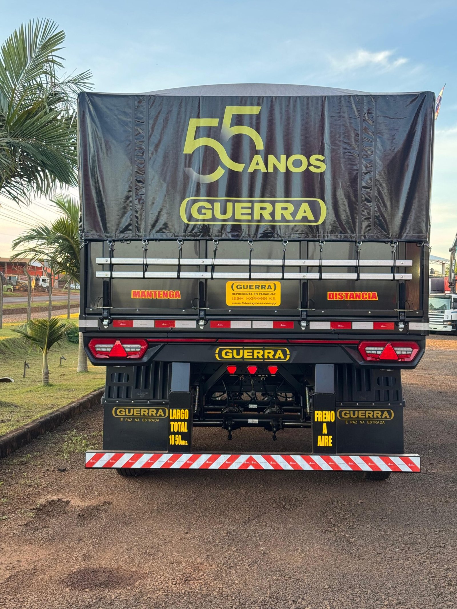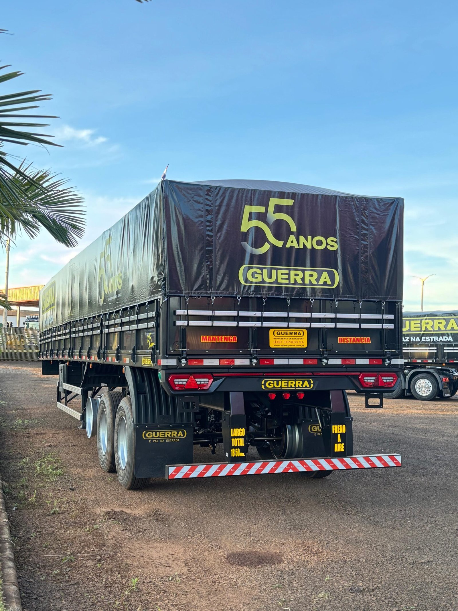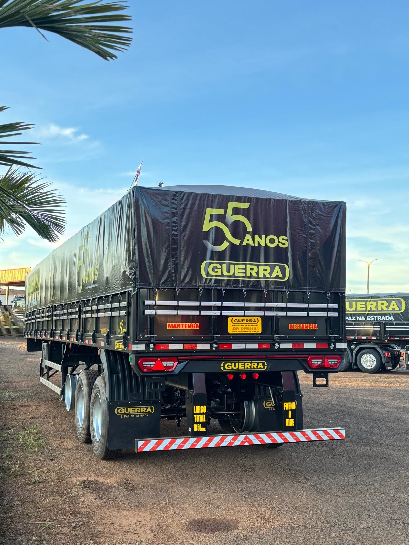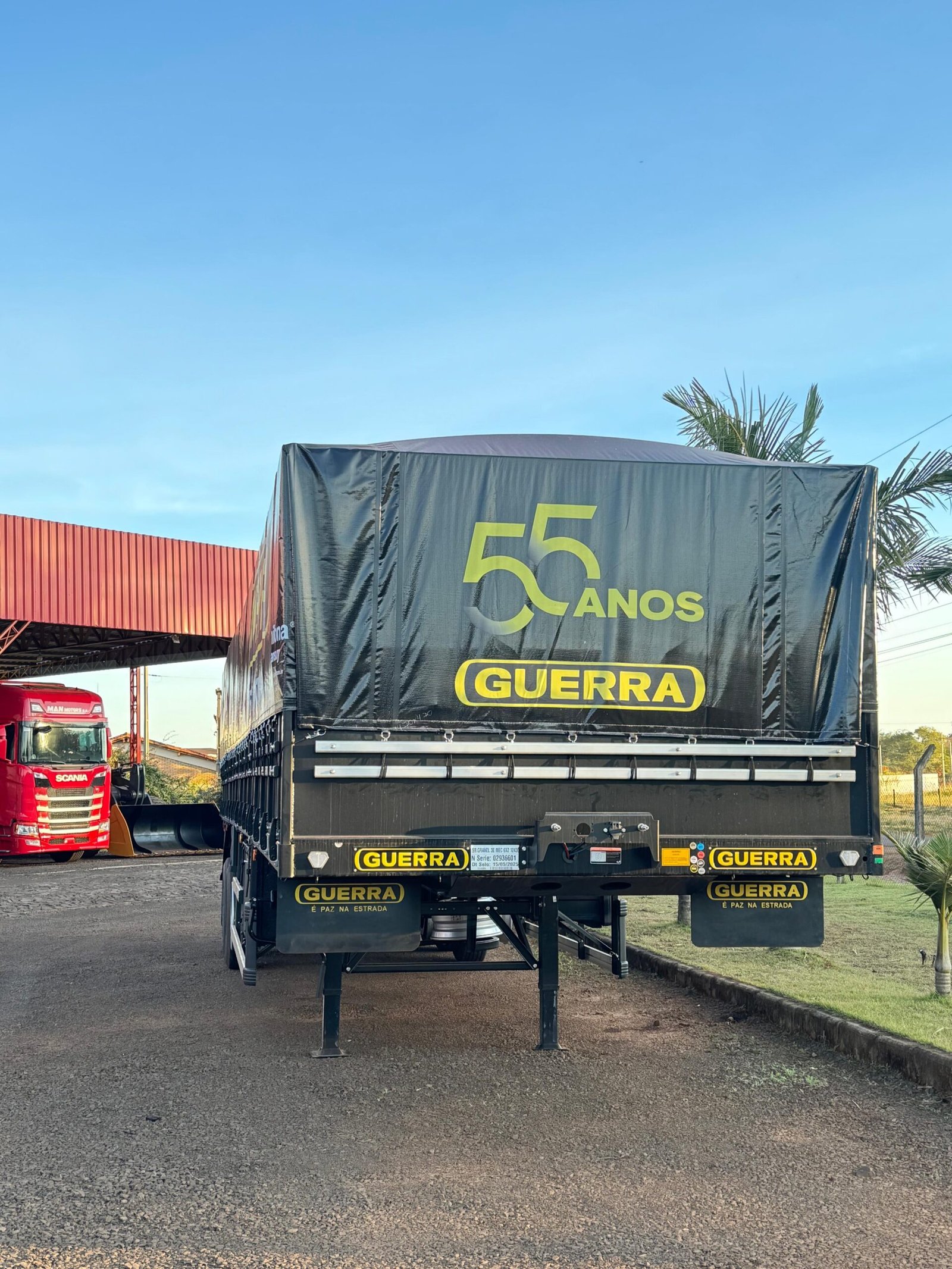 Carreta Guerra 2025, edición especial 55 años, medida 12,40 / 2026 con 1º eje elevable y vigas 80×80. Unidad nueva y lista para trabajar.